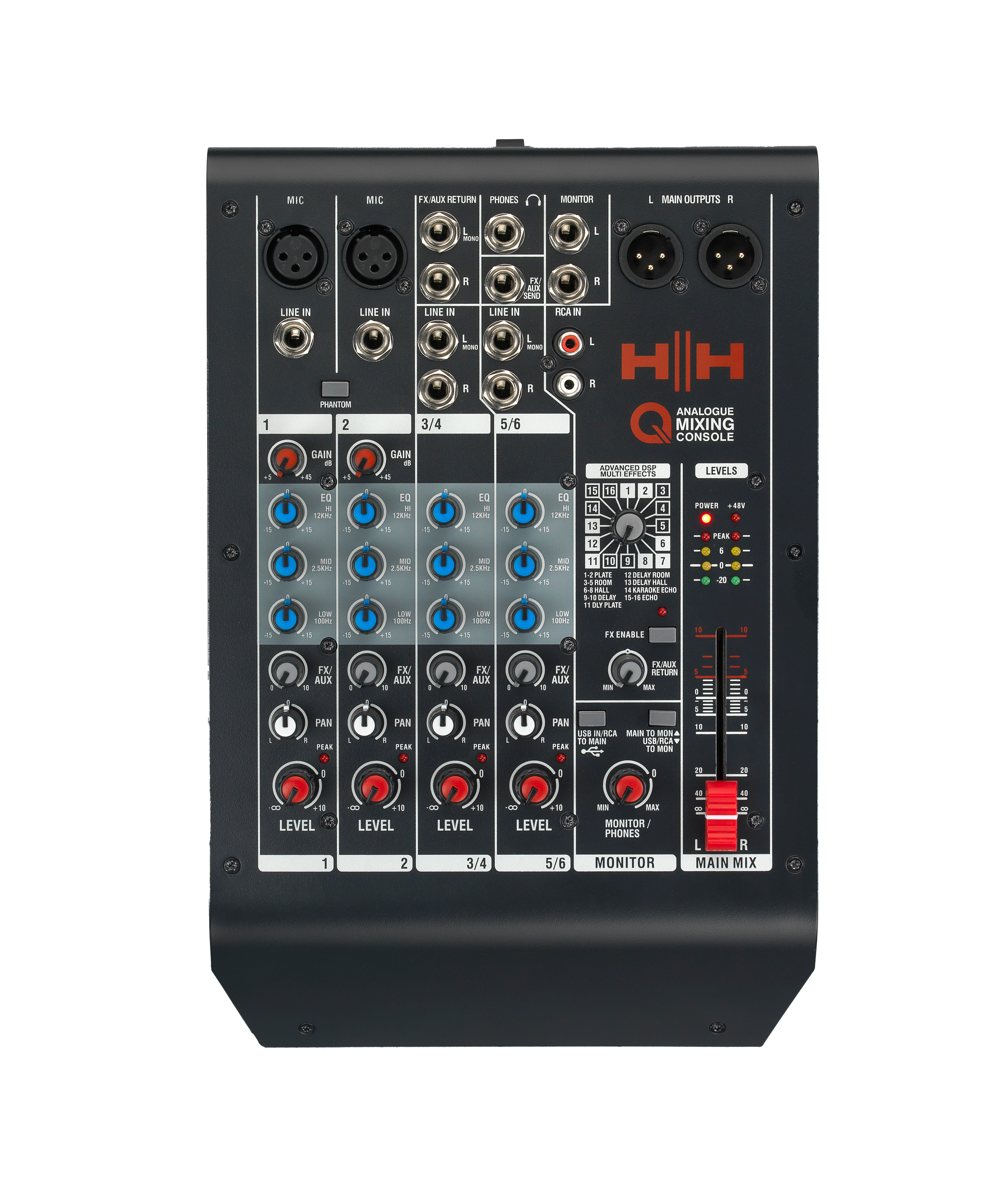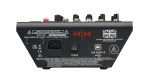Компактний 6-канальний аналоговий мікшерний пульт. Мікрофонні входи: 2 x XLR CH1-2. Лінійні входи (стерео): 2 x стерео ¼” 6,3 мм TRS CH3-6. Основні виходи: збалансований XLR. Блок FX: 16 ефектів. Еквалайзер: 3-смуговий (±15 дБ). USB Audio: 16-bit, 24-bit, Sample rate: 48kHz. Розмір: 93.5 x 208.5 x 316мм. Вага: 2.8кг.