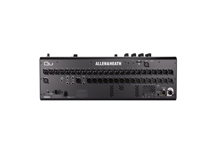Цифровий мікшерний пульт, 96 кГц XCVI. 38 входів (32 моно, 2 стерео, USB), 12 міксів (6 моно AUX/груп, 6 стерео AUX/груп), 4 матриці, 6 процесорів ефектів, порт SLink, сенсорний дисплей 7". USB-A — стереозапис/відтворення аудіо, USB-C — аудіоінтерфейс (32×32), SD-карта — запис/відтворення аудіо (16×16 при 96 кГц, 32×32 при 48 кГц). AMM (автоматичний мікшер), набір ефектів Qu FX, додаткові опції (Add-ons) — моделі DEEP, динамічна обробка, RackExtraFX. Асистент усунення зворотного зв’язку (Feedback assistant), асистент налаштування рівня (Gain assistant). 33 фейдери, 32 mic/line комбіновані входи, 2 стерео лінійні входи, 20 XLR виходів, 2 TRS та 1 AES3 вихід, 4 шари Channel Strip, 8 програмованих кнопок SoftKeys. |