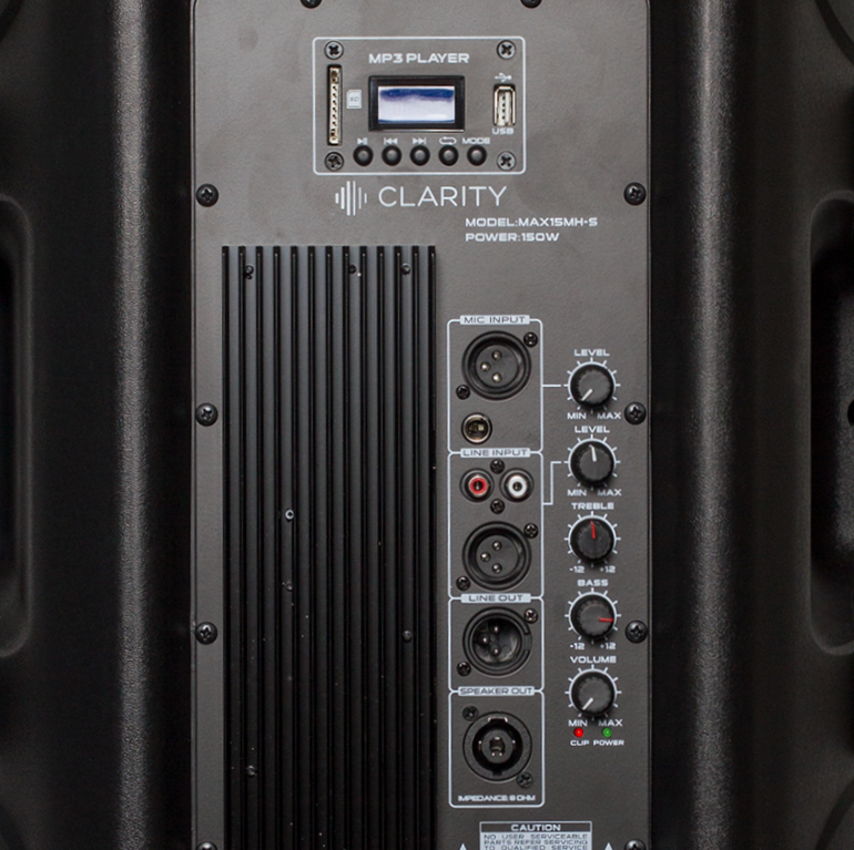 Clarity MAX15F3 12 672 грн. (є в наявності) Трьохсмугова активна акустична система, потужність 500 Вт, (Program) НЧ 15", СЧ 4.5", ВЧ 1", частотний діапазон 40Гц - 20 кГц (-10дБ), чутливість 99 dB, 1 х Mic (XLR+TRS) + 1 x Line (XLR+RCA) входи, один Line (XLR) вихід, один SpeakOn вихід (8 Ом), медіа плеєр: USB/SD/Bluetooth, 35 мм стакан для установки на стійку, корпус з ударостійкого ABS пластику, розмір (В/Ш/Г): 700х470х400 мм, вага 24 кг.