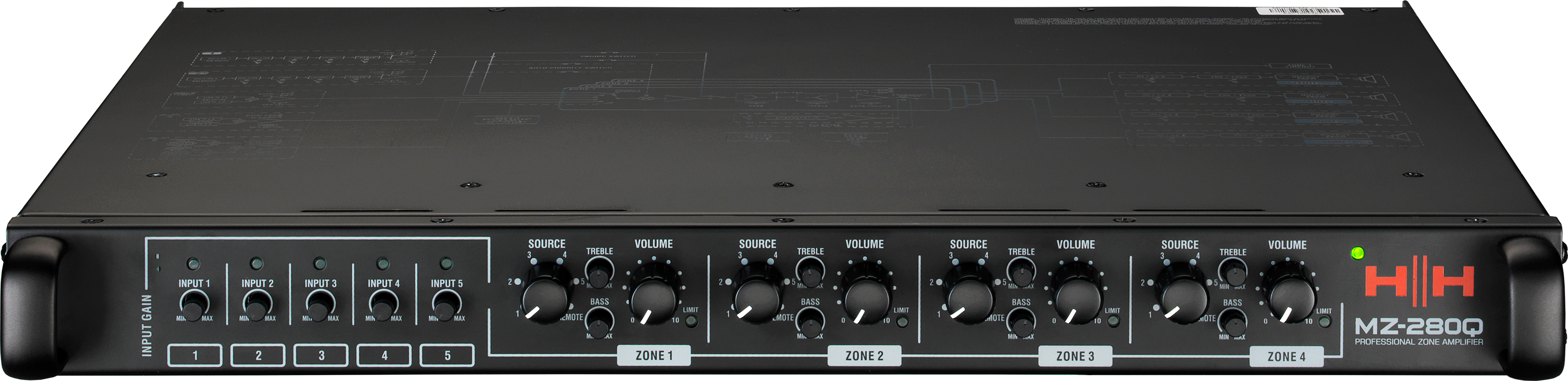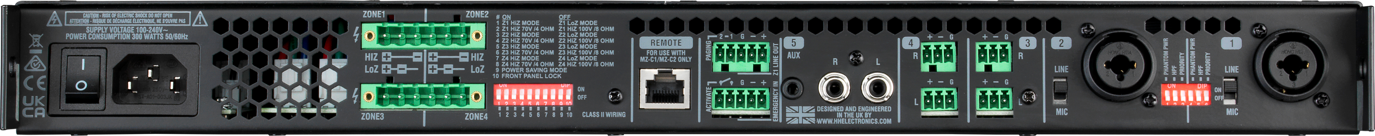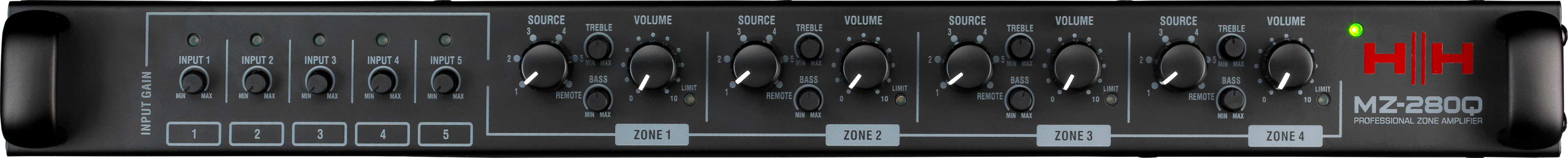 4-зонний інсталяційний мікшер-підсилювач, 4*280 Вт RMS Class D х 70 В/4 Ом, 100 В/8 Ом (налаштовується для кожної зони), Zone 1 балансний вихід Line Out, входи CH 1/2 - балансні комбо MIC (XLR, +48В, обрізні фільтри НЧ 120 Гц)/LINE (Jack 6,3 мм), CH 3/4 - балансні L&R (Euroblock 3,5 мм), CH 5 - стерео AUX (Jack 3,5 мм / стерео RCA). Незалежне регулювання еквалайзером НЧ і ВЧ в кожній зоні. Індикація вхідного та вихідного рівнів та перевантаження сигналу. Функція Output Limiter, Priority Ducking, Emergency Override (для сигналу аварійного оповіщення), Перемикач блокування органів управління передньої панелі. Дистанційне керування гучністю та вибору вхідного джерела (за допомогою модуля HH MZ-C2, підключається кабелем Ethernet, daisy chain). Живлення від мережі 100-240 В. Висота 1U. Набір для монтажу в стійку в комплекті.