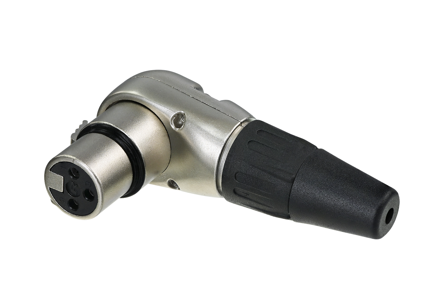 Кабельний роз'єм XLR-"тато" кутовий 3-контактний, фланець типу D, чорний корпус, позолочені контакти під пайку, пластиковий пакет.