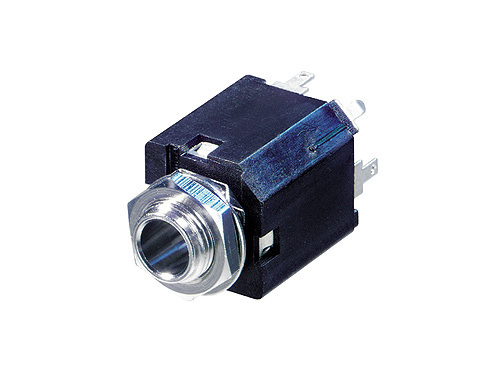 1/4" (6,3 мм) панельний стерео джек "мама" (роз'єм) для вертикального монтажу на друкованій платі, корпус з пластика, металевий фланець з гайкою і шайбою, з нормально замкненими контактами TIP та RING, 3-полюсний.