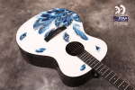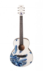 Електроакустична гітара. Форма - міні джамбо. Топ - цільний, ситхінська ялина. Задня дека та боковини - махагон. Гриф - африканський махагон. Брідж та накладка на гриф - штучний ебоні. Фініш - білий принт з синім пір'ям. Електроніка - TYMA T-50. В комплекті - фірмовий гітарний чохол, ганчірка, ремінь.