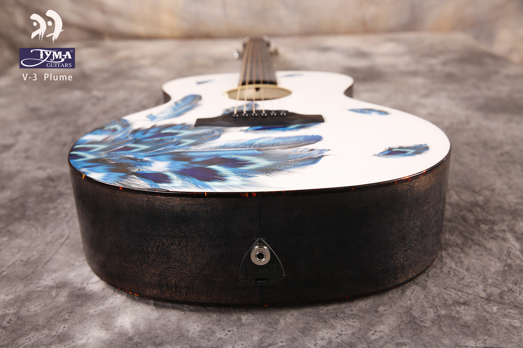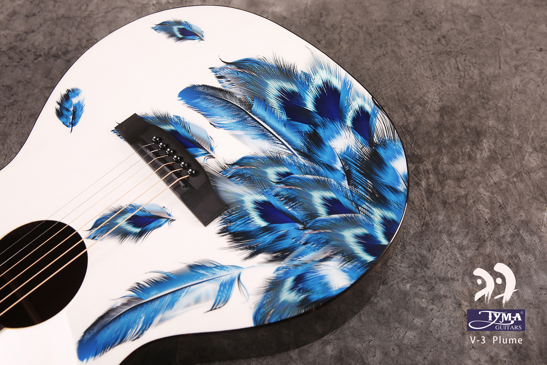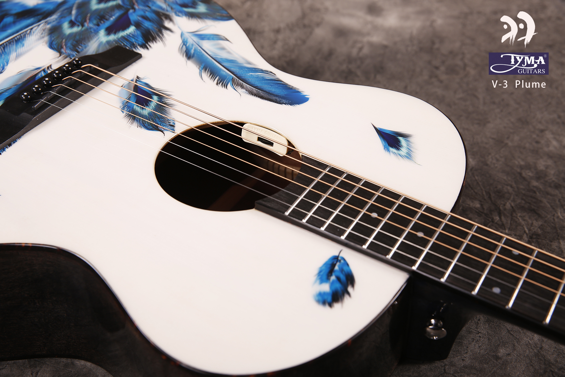 Електроакустична гітара. Форма - гранд аудиторіум. Топ - цільний, ситхінська ялина. Задня дека та боковини - махагон. Гриф - африканський махагон. Брідж та накладка на гриф - штучний ебоні. Фініш - білий принт з синім пір'ям. Електроніка - TYMA T-50. В комплекті - фірмовий гітарний чохол, ганчірка, ремінь.