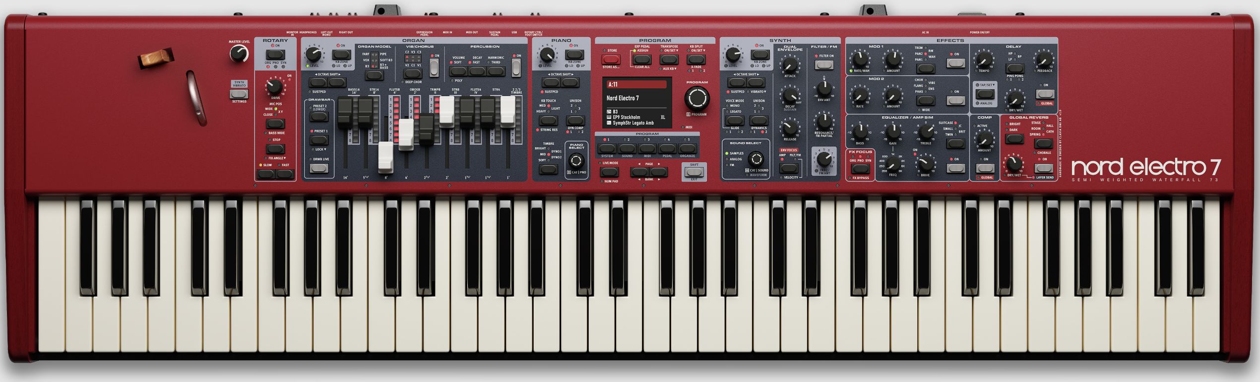 - Nord Electro 7 73: 73-клавішна (6 октав, мі — мі) напівзважена клавіатура типу «водоспад»