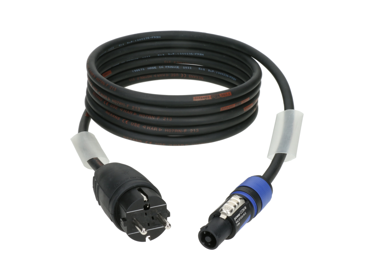 Гнучкий силовий кабель відповідно до IEC 60245-4, тип 66, перетин жил 3 x 1,5 мм², підходить для постійного використання на відкритому повітрі, придатний для великих механічних навантажень, клас CPR Eca згідно з EN50575, з прозорою термоусадкою для вільного маркування, проста і надійна система замикання закруткою, IP65 (пилонепроникний і захищений від водяних струменів) у сполученому стані, powerCON не можна вмикати або вимикати з розетки, коли він підключений до електричного навантаження або струму, перевірено якість відповідно до VDE 0701-0702. Довжина 1 м.