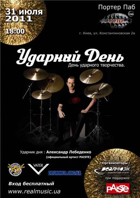 Как и обещалось, вторая серия концептуальных мероприятий "Ударный День" уже не за горами. 31-го июля в том "Портере", что на ст. метро "Контрактовая Площадь" специально для вас, с учётом отзывов и пожеланий "День Ударного Творчества" со специальным гостем, Александром Лебеденко, участником проектов Схід-Side, Закус band, Виа Гра.